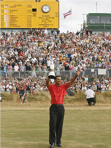 伍兹在2000年打出的269(-19)杆至今仍是英国公开赛历史上的四轮最低杆数,分别于2006年、2005年、2000年夺冠。