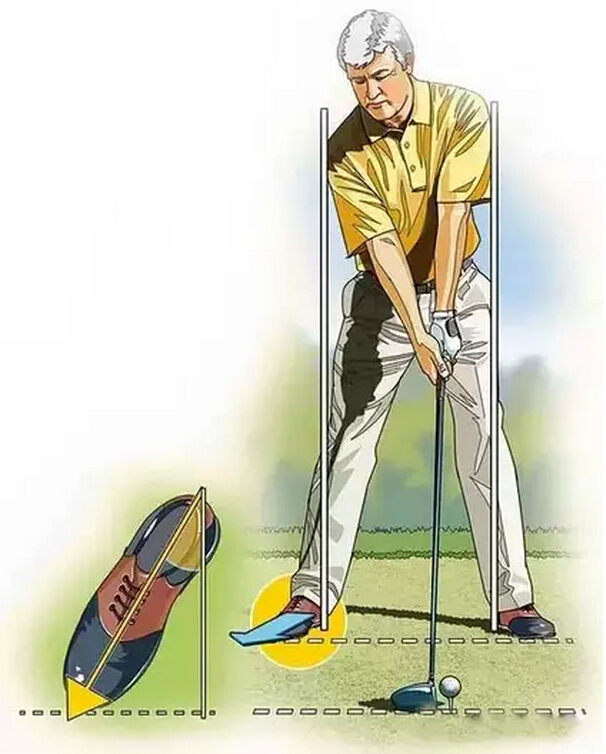 站位,双脚稍大于肩宽,后脚张开25度到30度。这有助于你在上杆时,在不抬高上体的前提下,加大转体幅度。使最初的脊柱角度保持不变,你的卷绕幅度和杆头速度都会有所增加。