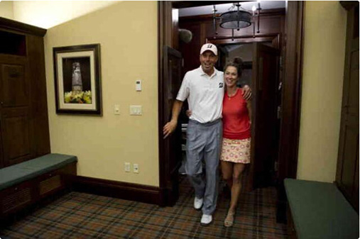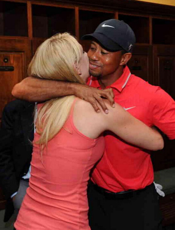 再看看老虎伍兹在更衣室里搂着前女朋友林赛·沃恩的热情(2013年,球员锦标赛)。