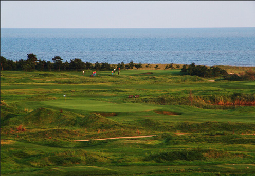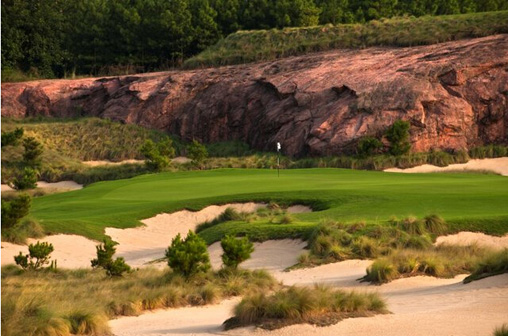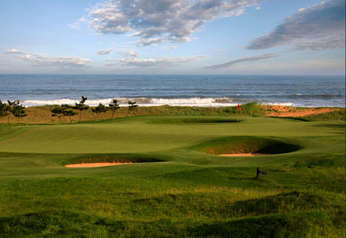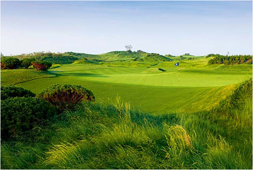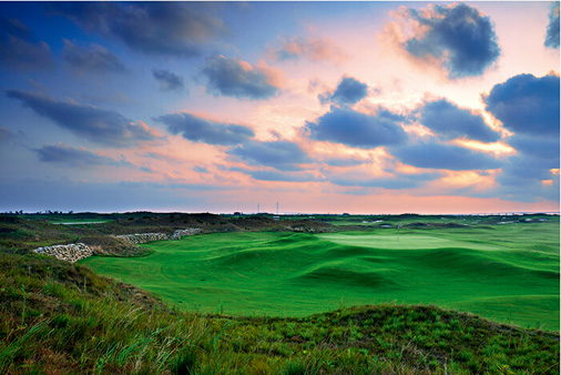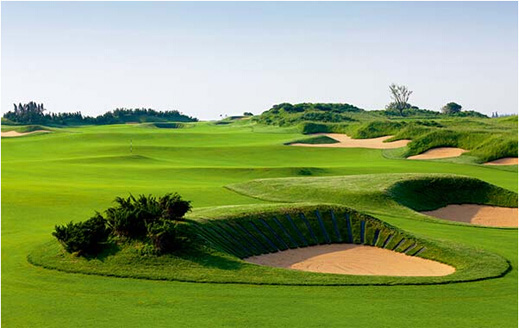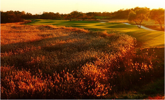 骨髓里深深烙着苏格兰或爱尔兰的林克斯球场,沙坑和长草狂野而蓬乱,那种自然的状态吸引着本能,刺激着感官。就像一块写满历史的纯粹原始的土 地,令人窒息,让人心跳加速。贯穿球场,障碍区随意散落,从外观上看不出经过精心策划,有的在落球区附近,有的甚至埋伏在球手的最佳落点处。球洞漂亮,却 两两不一,特色各具。果岭更是变幻莫测,有些很大,有些很小,有些像薯片一样起伏汹涌,有些被沙坑和水塘紧紧守卫……