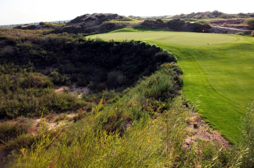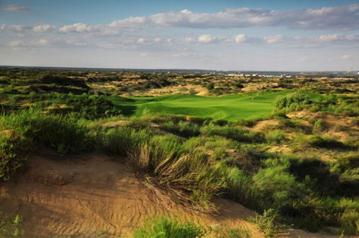 创造了人类与沙漠斗争中新的奇迹,天然的沙漠、绿色的草坪体现了人与自然和谐交融的生机景致。球场的青翠绿色如黄金上镶嵌的翡翠一般散发出夺目 光彩。凭风而立,一望无际的苍茫大漠充斥四野,夹杂着林克斯的狂野气息扑面而来,让人心旷神怡,球道的高低起伏间则蕴含着未知的凶险挑战。