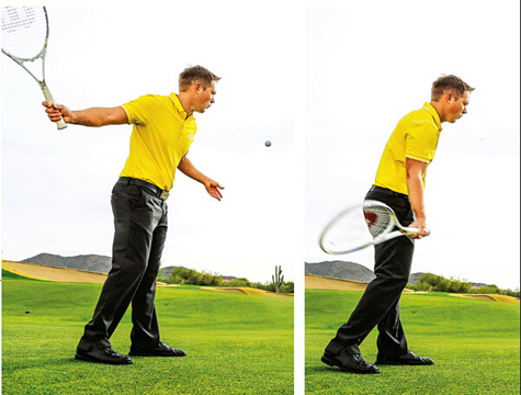 最后一次用网球拍击球是什么时候?无论是否经常打网球,甚至没想到自己做了一些能极大地帮助你提升高尔夫球技的事情。打网球时,凭本能尝试将球击过网,当球与球拍相碰时你的手肘是朝下的。如果很难想象这个画面, 可以找一盒网球和一个球拍,然后向上往前方击几个球,就好像你要将球击过网。试着让球刚好飞过球网,不想让球过高地飞上空中。