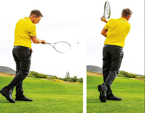 下面回到网球中的正手击球。为了把这种感觉嫁接到高尔夫挥杆中,可以进行以下练习:右手(右手执杆者)握杆稍微抬离地面。想象有一个球正向你飞来,打正手击球!让直觉掌管一切。练习几次,直到真正找到正手击球时的感觉。