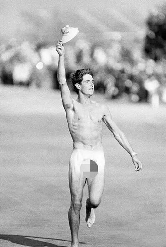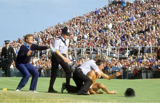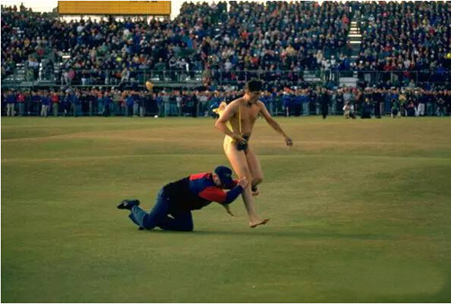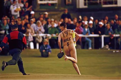 在1985年英国公开赛最后一轮,一位男性裸奔者冲上了英格兰皇家圣乔治球场的第18洞果岭。他一丝不挂,右手高举圈帽在果岭上奔跑,身材匀称而健美。