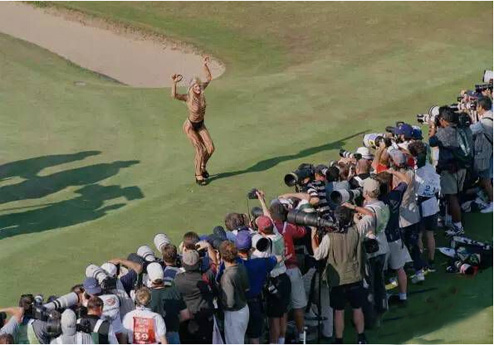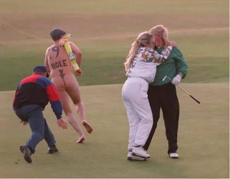 20年前的英国公开赛,圣安德鲁斯老球场第18洞,美国球手约翰-达利(上图绿外套)夺冠。正当达利的妻子走上果岭和丈夫相拥时,一位名叫马克·罗伯茨的男性裸奔者冲上了果岭。他也一丝不挂,右肩挎着一个儿童球包,背上写着第19洞的字样,箭头指向……