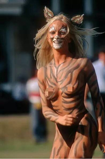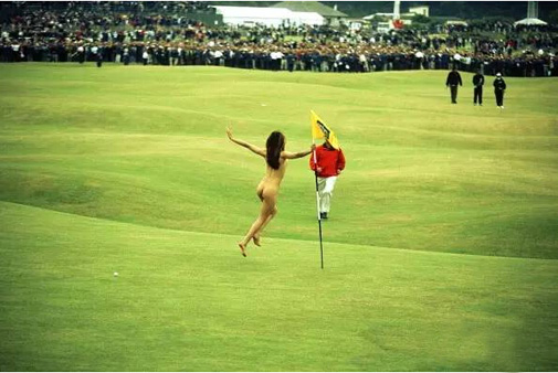 1997年英国公开赛,女性裸奔者出现了。这位身材曼妙的女性全身涂满老虎条纹,戴着虎纹耳朵,仅穿着内裤和高跟鞋。看这打扮,应该是冲着泰格-伍兹来的吧。