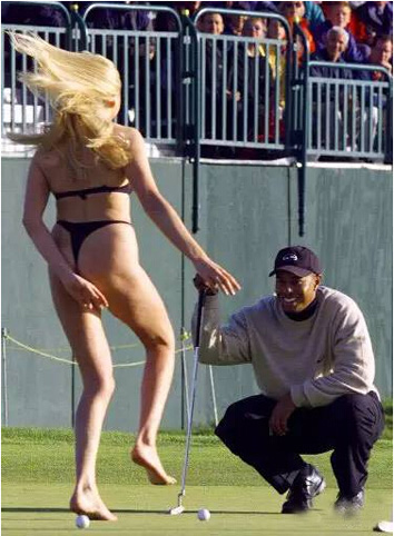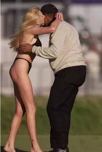 2000年英国公开赛最后一轮第18洞,伍兹的球已经攻上老球场的18果岭,夺冠时刻即将来临。这时,一位全裸女郎冲上果岭,她右手扶着旗杆,围着旗杆打转,向观众展示着她的胴体。