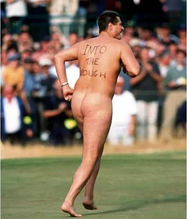 几年过后,英国公开赛再现男裸奔者,这位壮硕大汉背后写着“进长草”(Into The Rough),不知他在诅咒哪位球手。