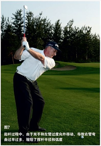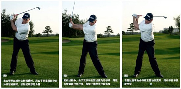 不过都是因为弯曲右臂过多过早,如果这种情况发生,在双手到达与腰同高时,右胳膊肘的高度就会低于左小臂。过早过多弯曲右臂会导致挥杆弧度和半径变窄。当右臂举起球杆上杆到顶时,用右手掌掌跟部分向外推球杆握把,以形成理想的力量(参照图5)。用右手掌掌跟部分向外推球杆握把可以避免右臂过度弯曲(参照图6)、左臂动作变形(参照图6)、挥杆半径和弧度变窄。