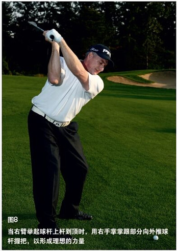 上杆到顶时,左上臂保持贴住胸部左边,右小臂应平行于(或接近平行于)脊椎(参照图7),胳膊肘平面趋于水平(参照图7),这样可以形成正确的杆身平面、理想的力量和对杆身适当的支撑。上杆到顶时,右手掌掌心朝外(不是朝上)(参照图7),这样可以形成正确的杆身平面和杆面角度。有些球手方向不好都习惯将右胳膊肘内扣导致右小臂和地面垂直(参照图8),这样右手掌掌心就会朝上(参照图8),导致杆身位置偏离平面,杆面指向错误。