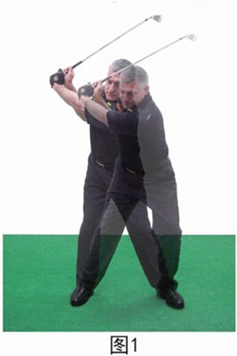 上杆时,当双手达到右肩同高的时候,左膝和胯部就开始水平向左(目标方向)移动。在移动过程中,杆头的惯性会带着双手、双臂和球杆继续上杆(参照图1)。