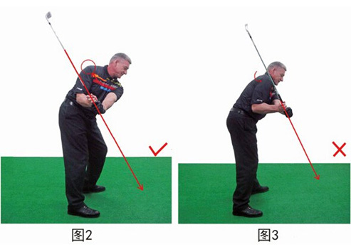 上到顶以后(即上杆完成),先抵住跟随肩(即右手球手的右肩),也就是延迟肩膀转动,下拉引领臂(即右手球手的左臂),这样就可以形成正确的杆身平面(参照图2)。