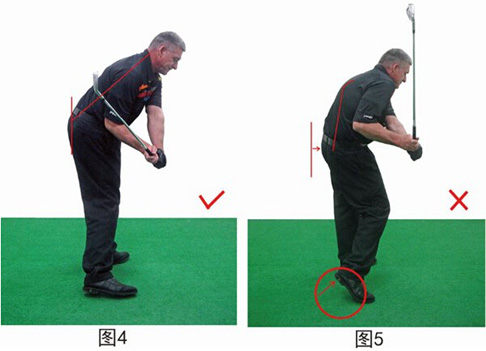 在下杆初期到中期,必须保持右脚跟(右手球手的右脚跟)踩地,这样才能保持脊椎角度,防止跟随肩太早向外移动(参照图4)。