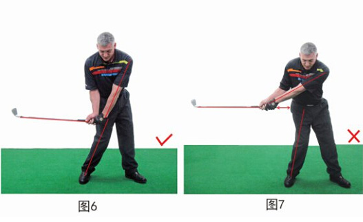 当下杆到杆身与地面平行后,引领手臂需和右腿平行(参照图6)。这就意味着手臂的挥动和身体的转动配合和谐,时间点正确。要注意保持引领臂和杆身之间的角度(参照图7)。