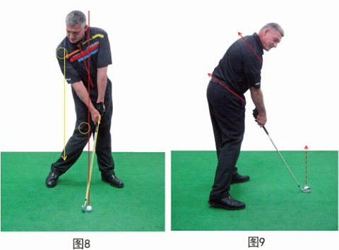 在击球瞬间,双手引领杆头,即球杆握把向左倾斜,一般称为“杆身向前倾斜”(参照图9)。