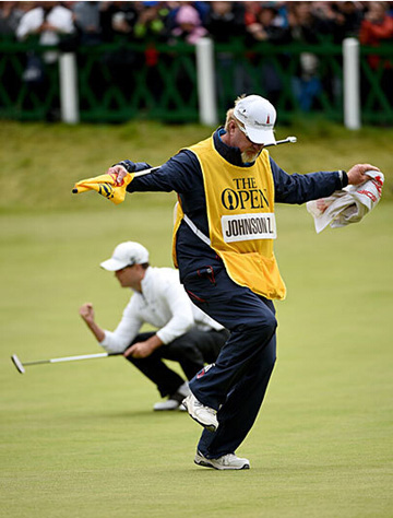 当约翰逊在老球场的最后一洞装下小鸟后,他的球童达蒙-格林表演了小鸟的姿势,引起了关注。这位球童不仅会表演,而且球技也不赖。多年来,格林一直征战在稍低水平的高尔夫赛事中,赢得过75场迷你巡回赛的冠军。格林是在15年前决定转作一位球童的,他见证了约翰逊所有的胜利。