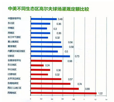 相对其他行业,高尔夫球场灌溉效率更高、节水水平更先进,这突出表现在灌溉水利用系数和灌溉定额这两项参数上。