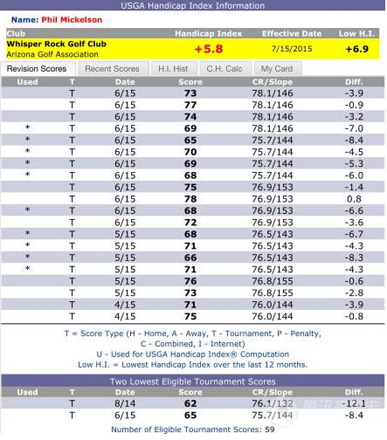 可以提取的伍兹最近二十轮比赛中最好的十轮成绩总差点微分为-57.9,平均微分-5.79,再乘以0.96的系数是-5.5584,所以得到的伍兹差点指数值为+5.5。