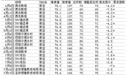 当然,这并不算是伍兹最精确的差点指数,因为手上没有他平时练球的成绩记录。不过用正式比赛的表现说明问题,已经够用了。这张表格其实还告诉一件事情,如今的伍兹仍然是位稳定的负差点球手。即便是那十场没有被提取成绩的“烂球”,伍兹的平均差点微分也达到了-0.9。