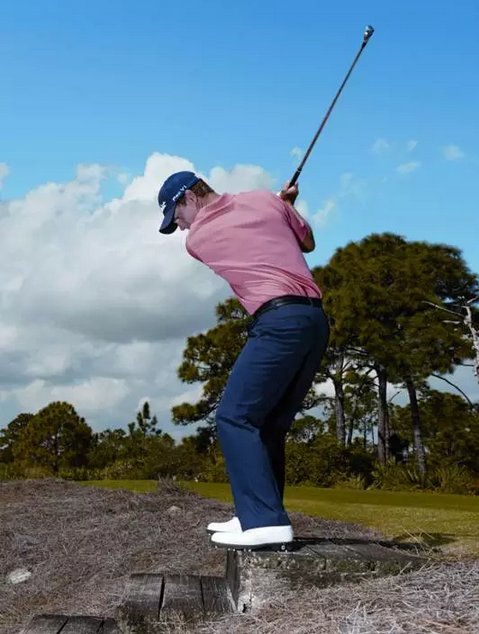 挥杆平面更陡峭一些。上杆到一半时,杆身要比正常情况下更陡直;在上杆顶点时,保持双手的位置高于右肩。