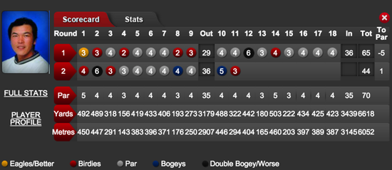 在当前的成绩榜上,仍然有8人暂时排在并列第1位,包括了尚未开始第二轮比赛的6位首轮并列领先者——迈克尔-艾伦(Michael Allen)、马克-道森(Marco Dawson)、杰夫-斯鲁曼(Jeff Sluman)、李-简森(Lee Janzen)、卫冕冠军伯瀚德-兰格、西蒙尼斯,另外一位第一轮的并列领先者巴特-布莱恩特(Bart Bryant)在完成的2个洞里以平标准杆收杆,与剩下6洞待打的苏格兰名将科林-蒙哥马利一道暂时处于会馆领先的行列里。蒙蒂在打完的12个洞里拿到了4只小鸟,吞下了2个柏忌,追至会馆领先,比首轮前进了11位。