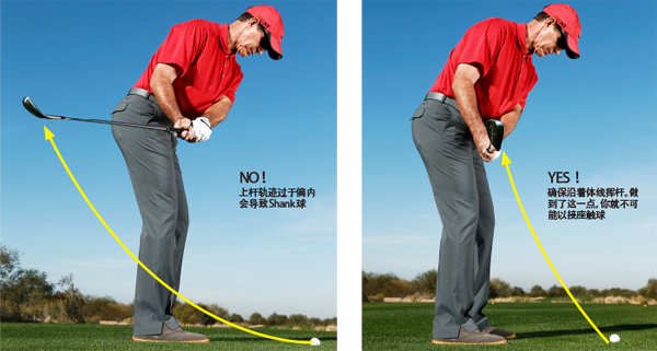 要解决这个问题,只需使站位与目标方向线平行,杆面垂直,然后集中注意力在上杆和下杆时使球杆沿着体线移动。只要下杆时球杆没有过度自内向外移动,你就不可能以接座触球
