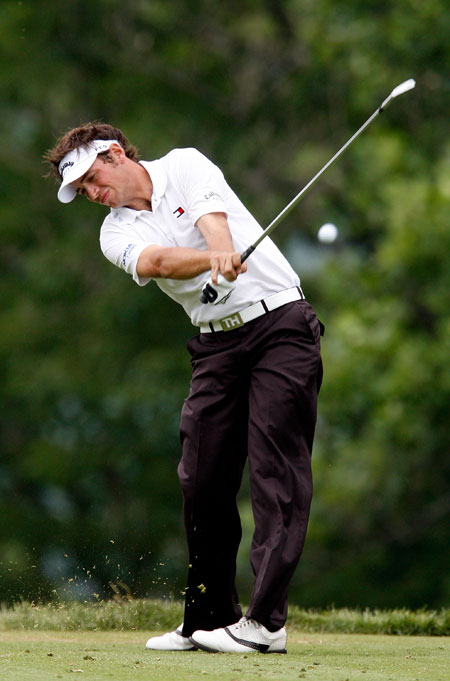 我 们可能已经发现所有的铁杆好手几乎都有一个共同之处:触球时的头部位置要比定位时的低一些。并不是触球时他们身体前倾或者低头,而是增加了膝关节的弯曲。 在触球时,他们的膝关节会向下并向前在一条斜线上运动。个人以为这也就是为什么老虎左腿膝关节需要动手术的原因。也许,我们会认为这样很容易打得过厚。但 是如果杆身朝目标方向前倾,杆身的倾角就会大于左臂,触球就会非常扎实。