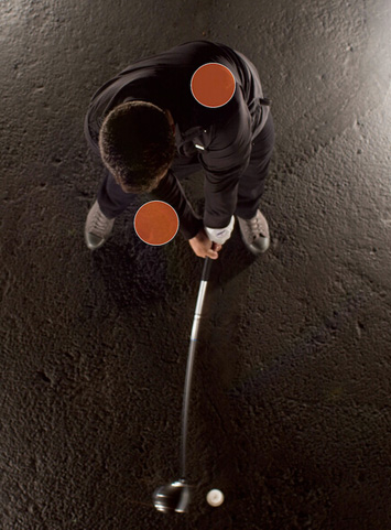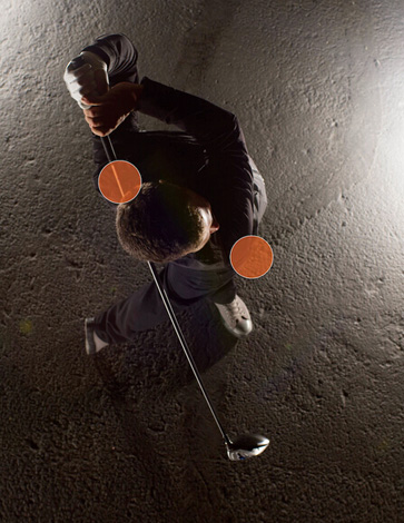 击球时,双肩会自然稍稍打开,就像图中所示。但如果打开太多(很多高差点球手经常出现),这意味着下杆时,仅仅利用身体的转动来拖动球杆向下运动,而没有释放手腕。将头留在球后,通过触球区时感觉挥动的双臂超过了身体。