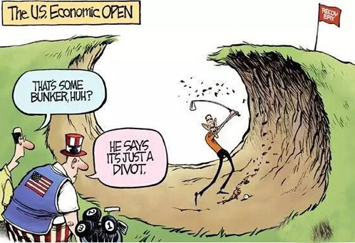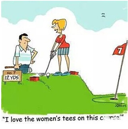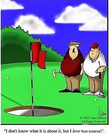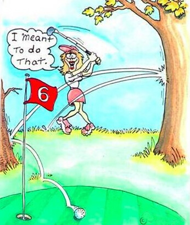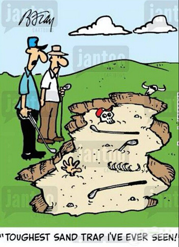 ▲—“他是把球打进沙坑了,是吧?” —“噢,不。他说那地只是块打痕。”