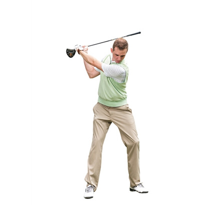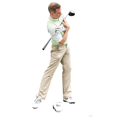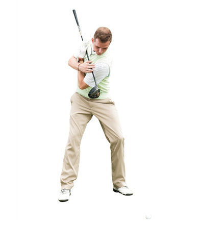 双脚开立,比肩稍宽,双膝微屈。双手在胸前十字交叉,横抱球杆。向右转肩,直到最大角度,坚持数秒。杆套放在脚下,作为衡量左肩是否摆动到位的参照物。