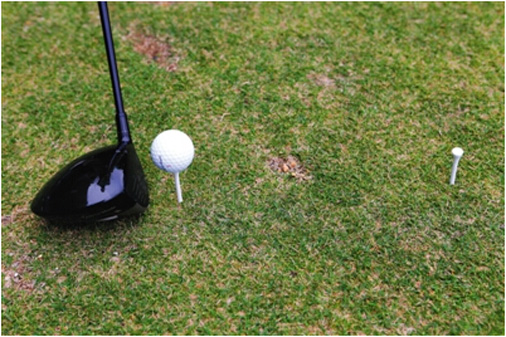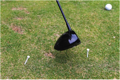 将两个球Tee依次摆放,距离约为一脚宽,当你击球时,只允许球杆碰到第一个Tee,如果碰到第二个就算违规,目标是改善你的击球角度,对,要尽可能地使你的杆头扬起来,才能获得更完美的起飞角度。