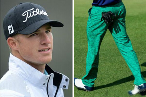 而颜值本来极高的小哥摩根-霍夫曼在美国大师赛上选的裤子也是分分钟让人感觉“瞎了狗眼”,也不知道这种绿色如何形容: