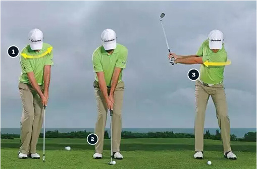 这里有一个简单的训练方法,以让你获得正确的转肩,而不会导致臀部的太多转动:坐在球车的边沿(或者其他类似的地方,只要你能得到类似的姿势)。双手握住一根球杆放在双肩线上,感觉自己正在进行正常的瞄球动作,然后做简单的转肩,使杆身指向前方。这时应该能够感觉到身体左侧有一个伸展动作,这就是好的。