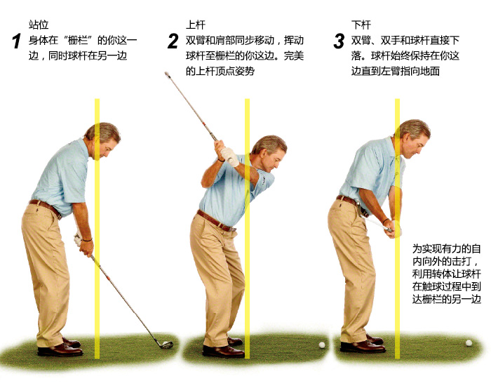 采取预备站位,双臂在脚尖上方下垂。当你摆好姿势后,想象有一道栅栏或者一堵墙刚好从右手拇指以外穿过,与目标线平行(下左图)。注意栅栏的另一边只有杆身和杆头——其他的都在你这边。启动上杆时你的目标是:同步转动双肩和挥动双臂,让杆身和球杆从栅栏的另一边跳到你这边(下中图)。此时球杆处于正确的上杆顶点位置。为了产生想要的自内向外的触球,只需让一切都保持在你这边,直到下杆过程中左臂朝下指向地面。要做到这点,让双手、双臂和球杆直接下落,同时双肩沿上杆时的弧线路径返回。这个动作很像是在保持高尔夫站位姿势的同时朝你左侧的一个人做下手投球。只有当你大幅度扭转髋部通过触球时,杆身和杆头才能冲破栅栏重新进入另一边(就是它们起步的地方)。只要掌握了这个动作,你将体会到与以往不同的力度——好像你正在击中球的后内四分之一处。恭喜!你刚刚练就了完美的攻果岭击球路径。 (来源:高尔夫杂志)