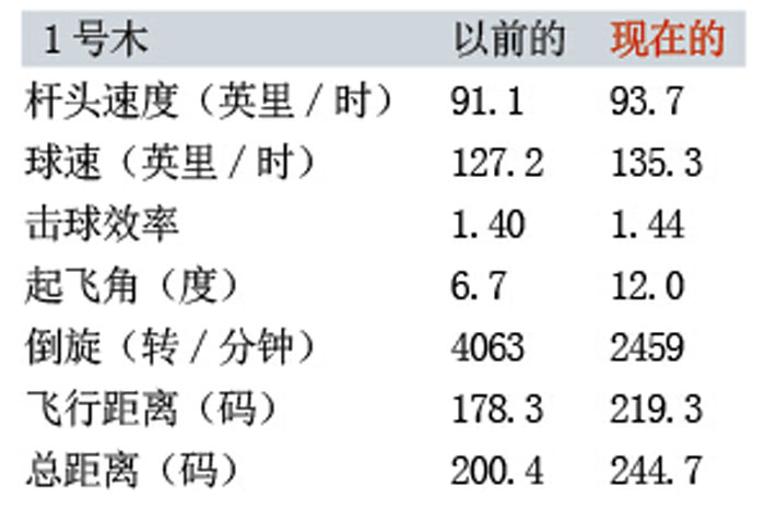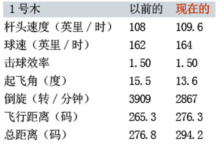 结果:高起飞角和低倒旋是远距离的双重前提,史蒂夫的新1号木抬高了5°起飞角,减少了1600转/分钟的倒旋量,并且令击球位置更靠近中心——它使动能传导更为充分。这一系列改变令他的球速提高8英里/时,由此换来44码的开球距离。