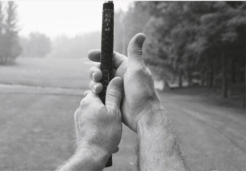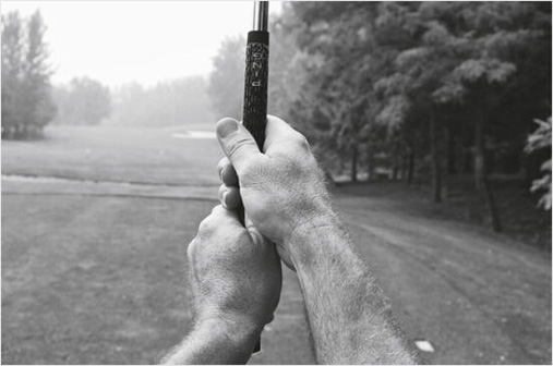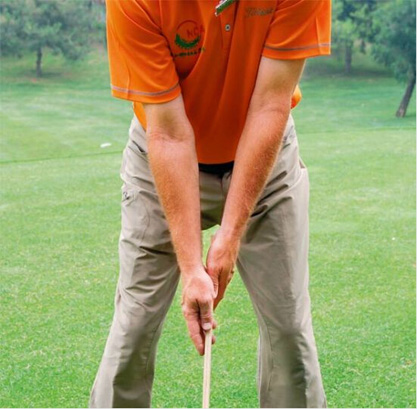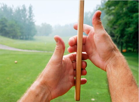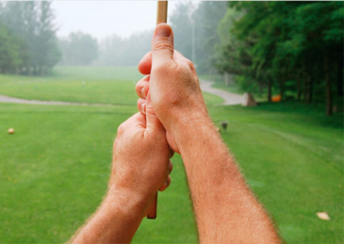 用手掌握杆会额外增加本可避免的紧张感,也会阻碍手部神经反射的正常传导而影响手部活动。同时也会使我们的手腕僵硬。在挥杆过程中,手腕应该和双手拇指或手背保持一致。注意,上面所谈到的百分之八十的意识应该贯穿于挥杆全过程之中。