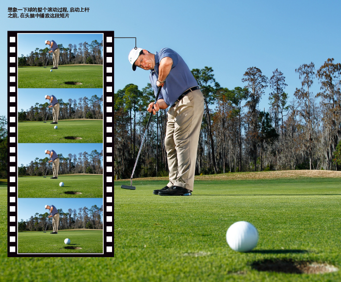 不要只是想象球滚落洞杯,你应该争取想象球自始至终的滚动过程(包括速度和路线)。站位之前,在脑海中制作一段推击短片。启动上杆之前,播放一下这段短片,让你的击球与想象中的样子保持一致。高尔夫与其他项目(比如棒球、橄榄球、篮球)不同,你在做动作时并没有眼望目标。因此,站位时对你要做的事形成一幅清楚的画面至关重要。制作一段短片,在击球时播放这段短片,你就能够提高推击成功率。