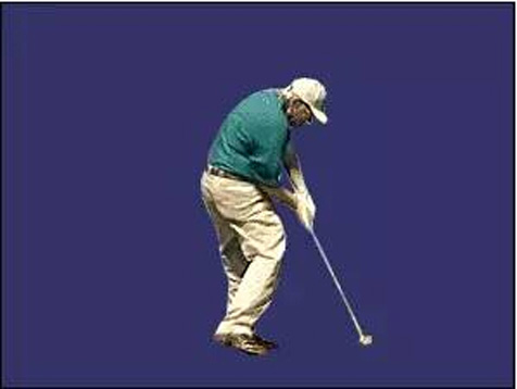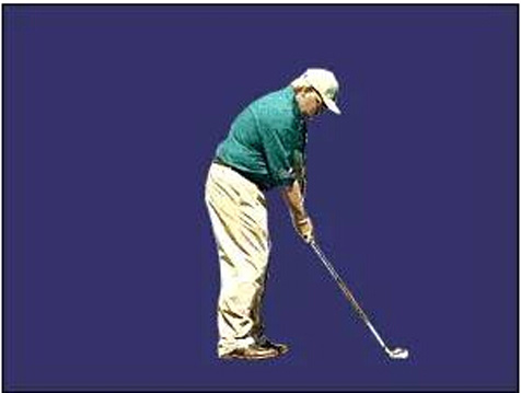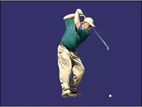 你可以看到达利的上杆幅度有多大,在上杆至顶点式他得杆头指向地面。应该没有教练会教你这样挥杆,但达利能够控制这种挥杆,并在每次击球时重复这一动作。为了实现这样的上杆幅度,达利的髋部转动很明显,他左腿弯曲程度可以证明这一点。