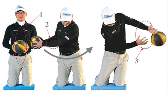 2、预摆时药球与腰部保持水平,躯干与骨盆同时转动。