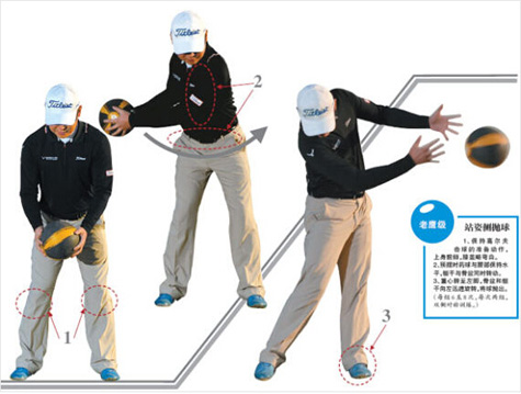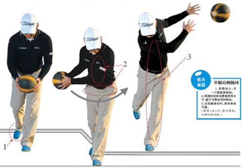 3、完成抛球动作,保持身体平衡。(每组6 至8 次,每次两组,双侧对称训练。)