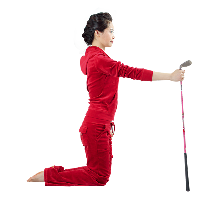 1. 跪立在垫子或草地上,身体立直,胸腔打开,伸直右手握住球杆。