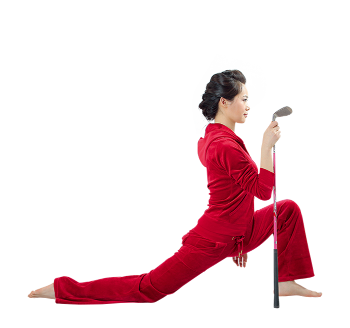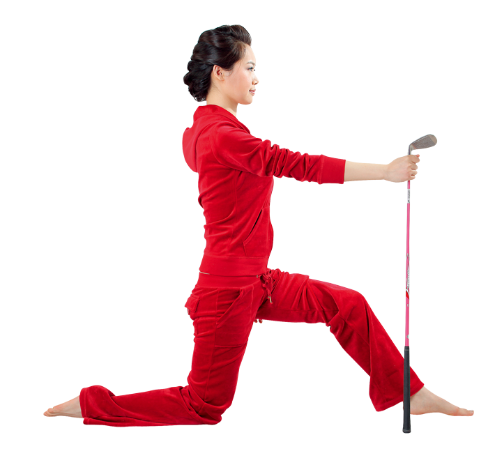 有规律地练习此体式可以强健腰肌、大腿肌肉,增加其柔韧性,活动髋部,有效预防挥杆转体时发生的腰背部损伤。练习时要配合呼吸,每次吸气时胸腔打开,呼气髋部下压,尽量做到极限位置。