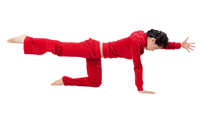 2. 吸气,左手右腿伸展出去,尽量让身体保持平衡;呼气低头,微收腹部,弯曲左手肘与右腿,尝试手肘碰到膝盖(碰不到没有关系,做到极限即可)。重复5~10次。