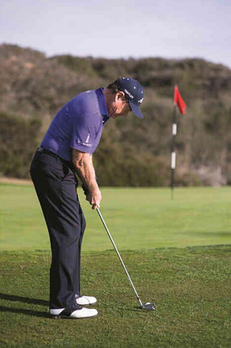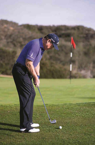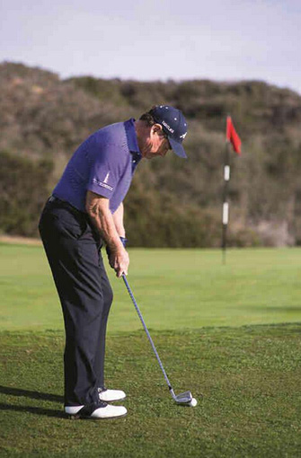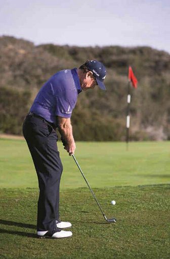 弗洛伊德会拿出5号铁,然后握短球杆,让杆身向目标方向倾斜,身体重心放在左脚。接下来,他会采用推杆动作将球切上果岭,然后让球滚向洞杯。