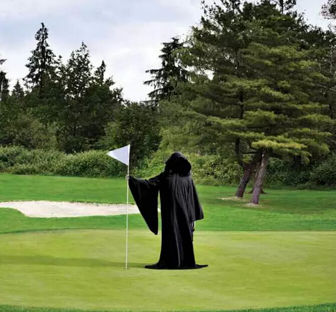 相反,如果你在球道上听到一声指向你所在区域的"看球",千万不要直站在那里,伸直脖子眺望,因为那样的话,你可能会成为小白球砸中的目标。你要做的是尽量掩护自己,比如蜷缩在球包之后,躲在树后或者藏在球车后面,尽量用手臂护住头部。