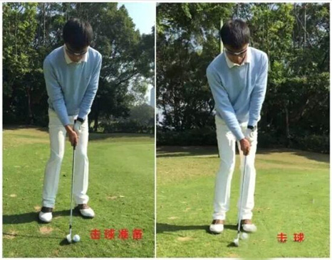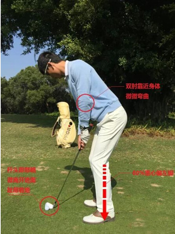 1、首先以P杆为例,握杆要采取推杆的握杆方法,握杆的时候比正常击球时的握杆稍短一点,手腕稍微提起,双肘靠近身体微微弯曲,类似推杆动作。球的位置放在中间靠右的位置,两腿站位稍窄,重心偏左脚60%左右。