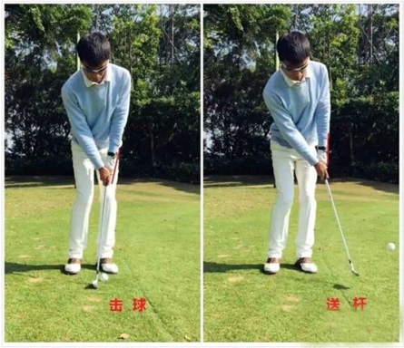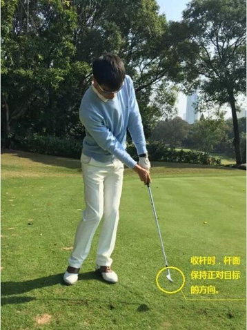 4、依靠肩膀转动力量带动身体,应确保在触球过程中由双手引领杆头运动将球击出去,击球瞬间手腕保持不动,这样左手腕背面将保持平坦,使杆面干脆利落地触球。