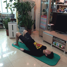 动作要领:仰卧,双脚与胯同宽,脚掌着地;双臂平直的放在训练毯上,保持不动;臀部收紧,臀、腰、下背部依次慢慢抬起,感觉身体前侧的胸腹部向上方舒展;然后慢慢放下,重复动作。