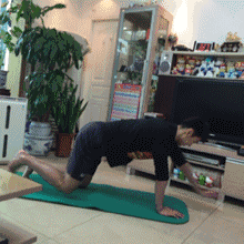 动作要领:跪撑在垫子上,膝盖与臀同宽;慢慢向上抬起伸直的左手臂,同时上抬右腿,尽可能达到最高的位置,停留2秒,放下,重复。动作过程中尽量保持头部到臀部的躯干接近平行地面,保持稳定,腹部紧张,不要弓身。