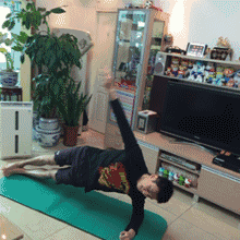 动作要领:手肘呈90度撑在训练毯上,脚尖略窄于肩宽着地,身体悬在半空,腹肌用力的同时保持屁股不要塌下去,眼睛看地板,不要抬头;从头到脚,整个身体要呈一条直线。保持静止不动,看你能坚持几分钟!